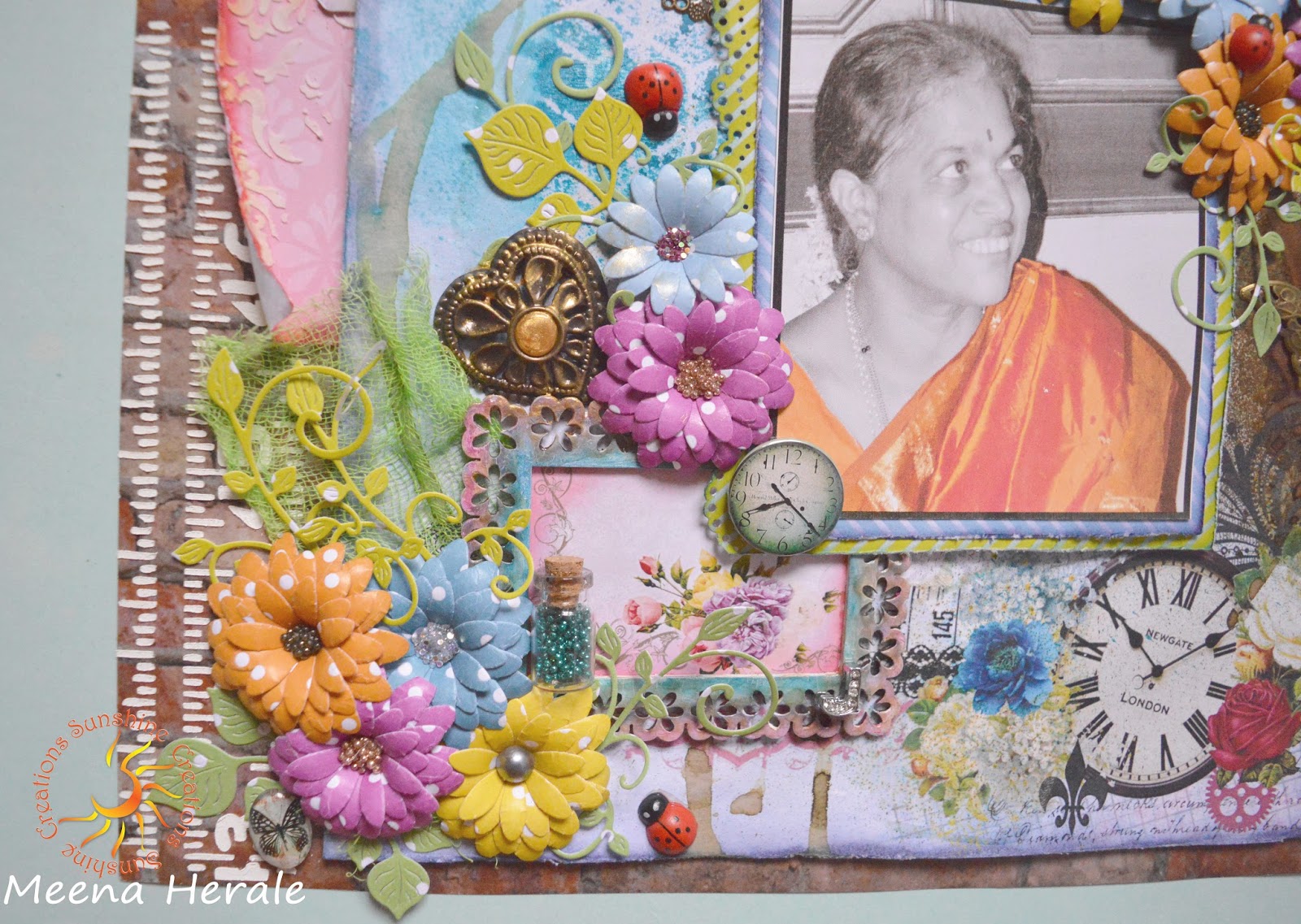 I wanted to gift her something unique so I made this scrapbook layout in mixed media. She loves dasies very much so I have used lot of handmade daisy in this project.